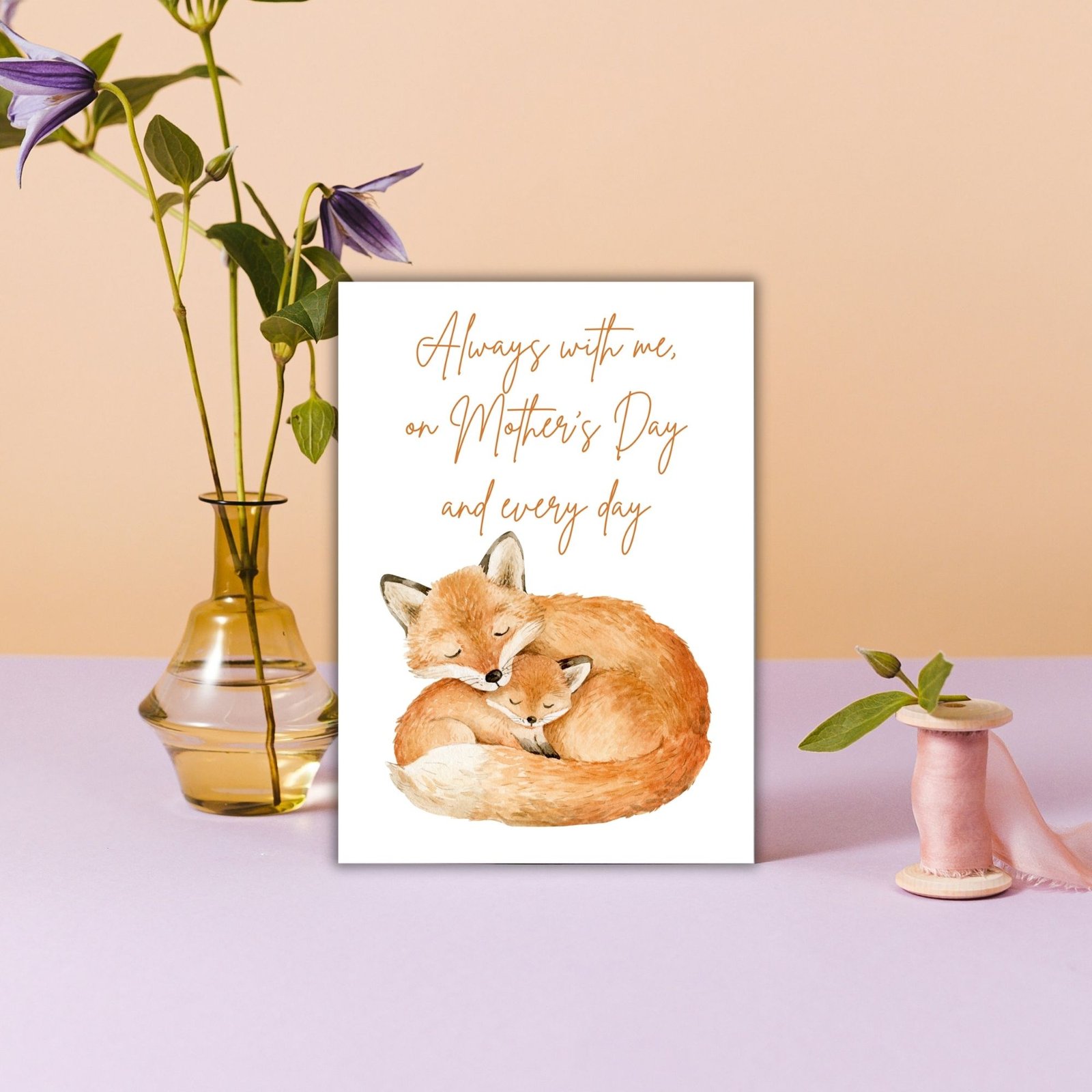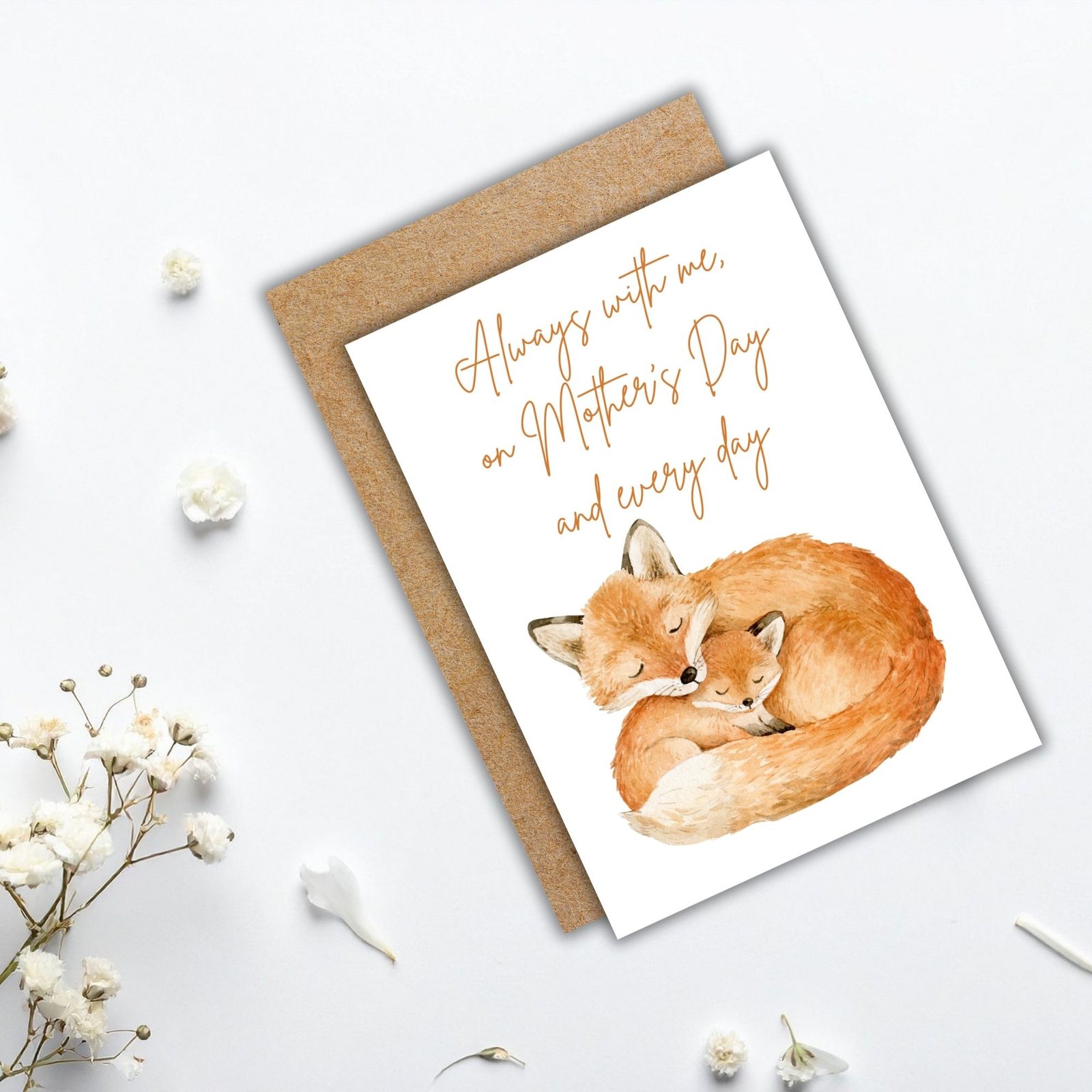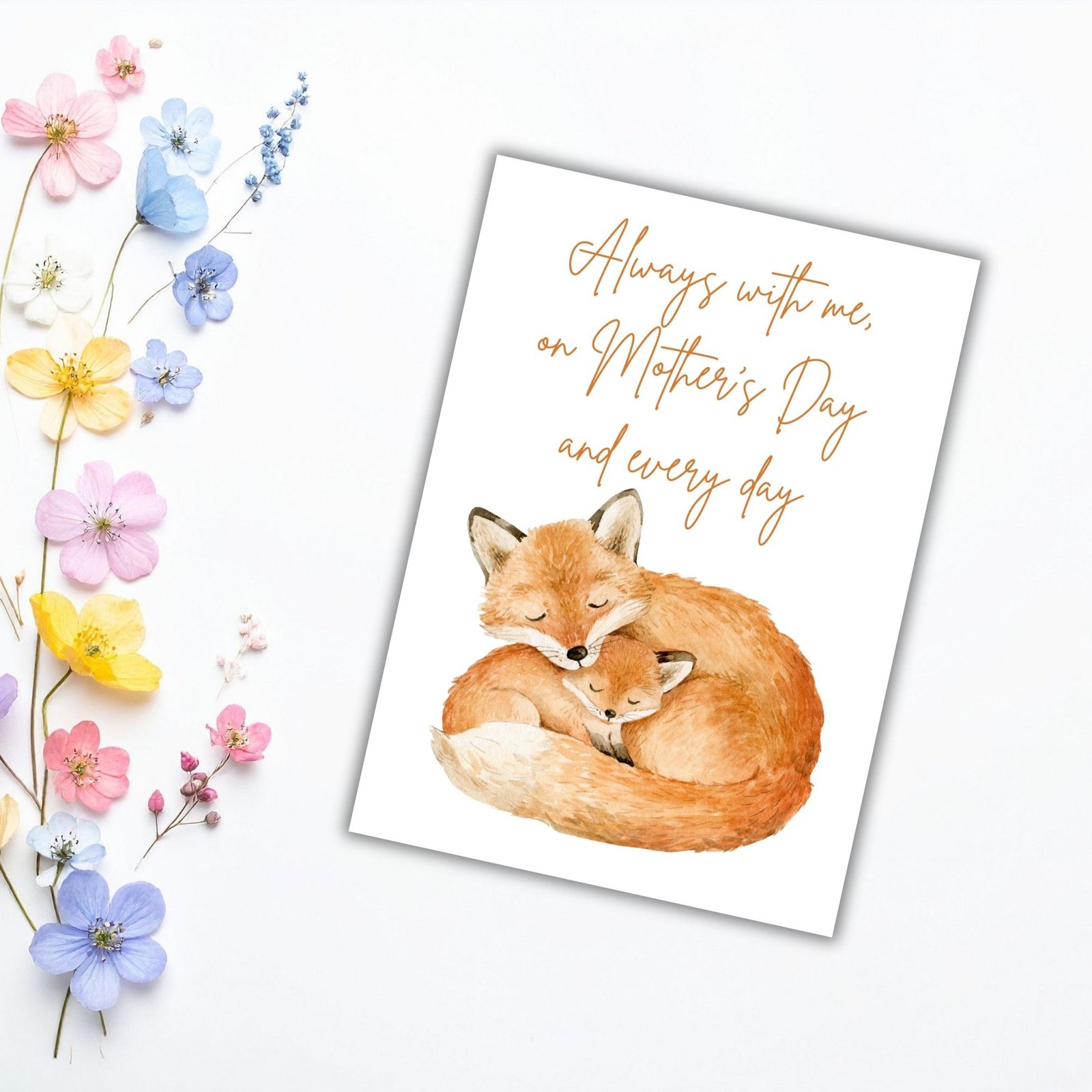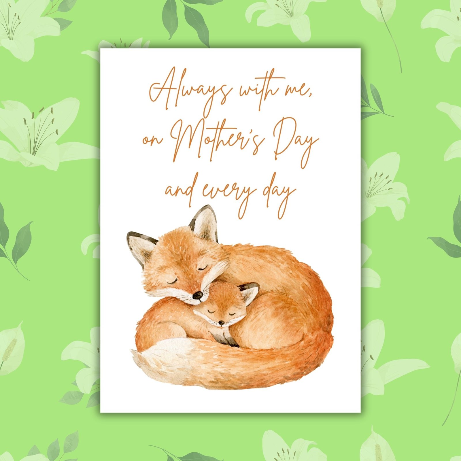 This tender card features two foxes curled together in a quiet embrace, paired with the words: