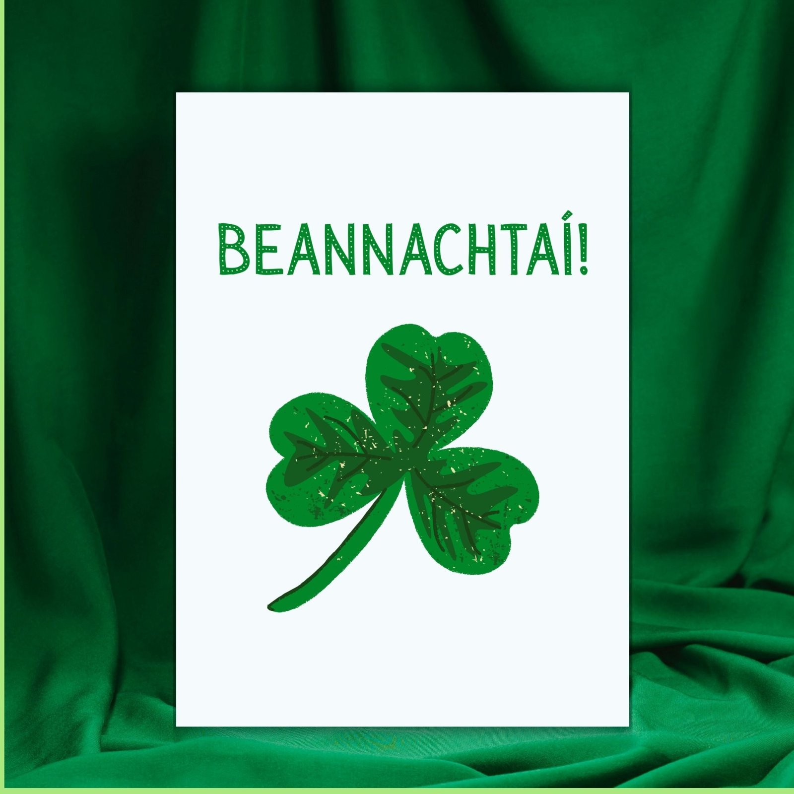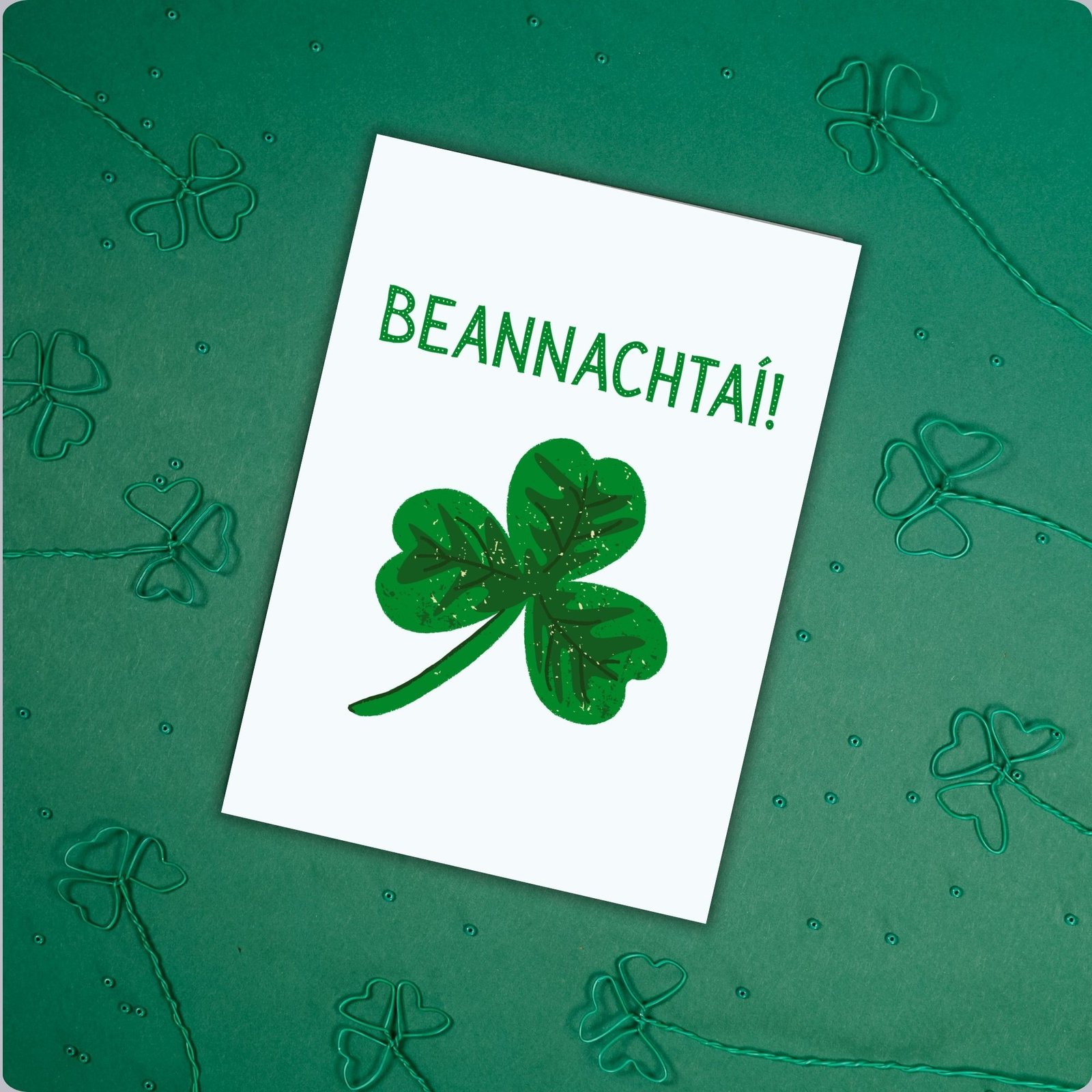 This card features a single shamrock with the joyful greeting “Beannachtaí!”, keeping the design clean, bright, and cheerful. Perfect for anyone who loves simple, authentic Irish-language greetings or wants a gentle way to celebrate St Patrick’s Day.