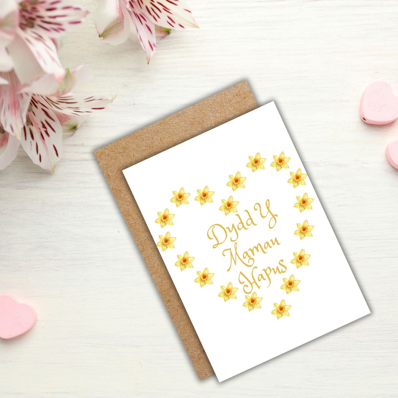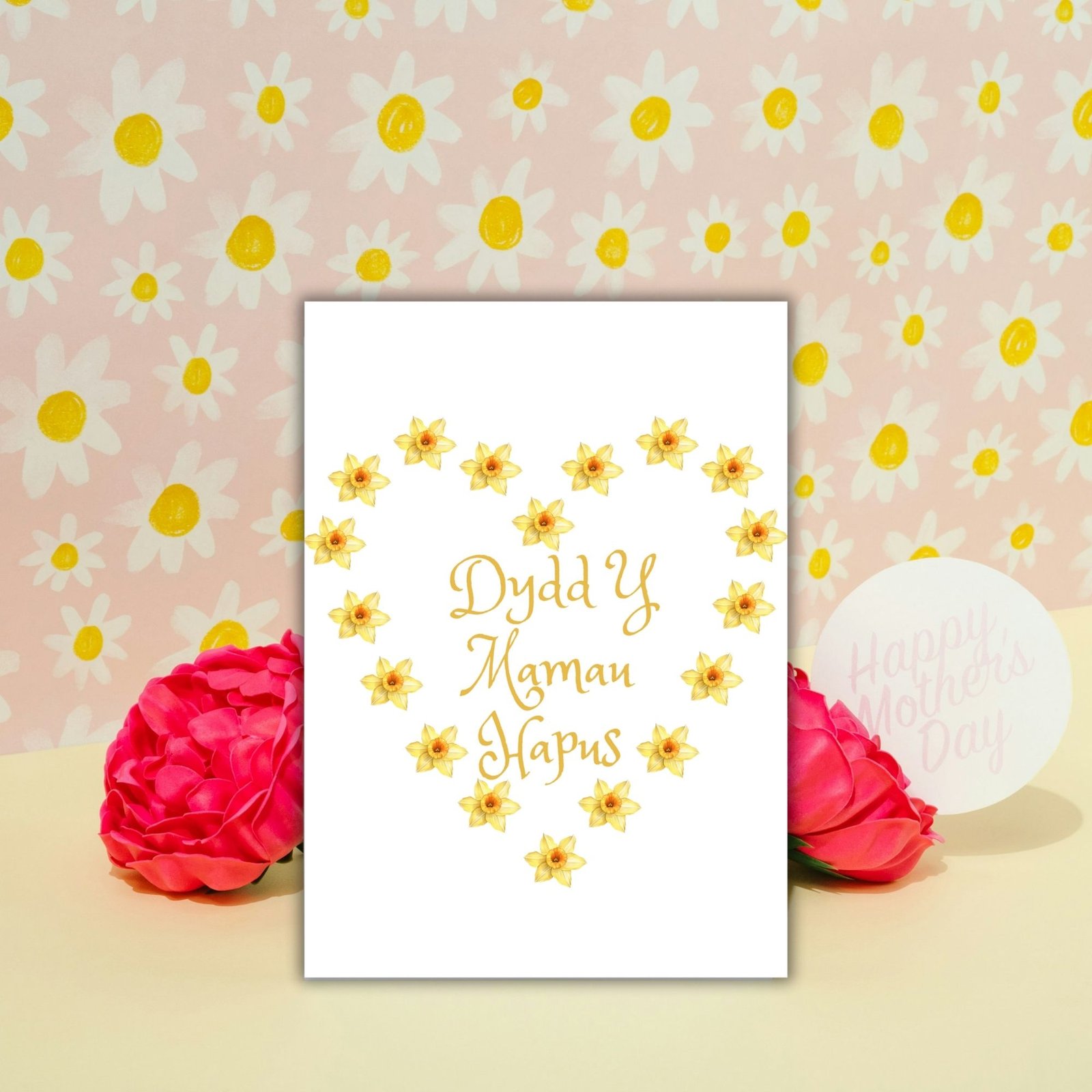 This cheerful Welsh Motherβs Day card features a bright daffodil heart and the message: