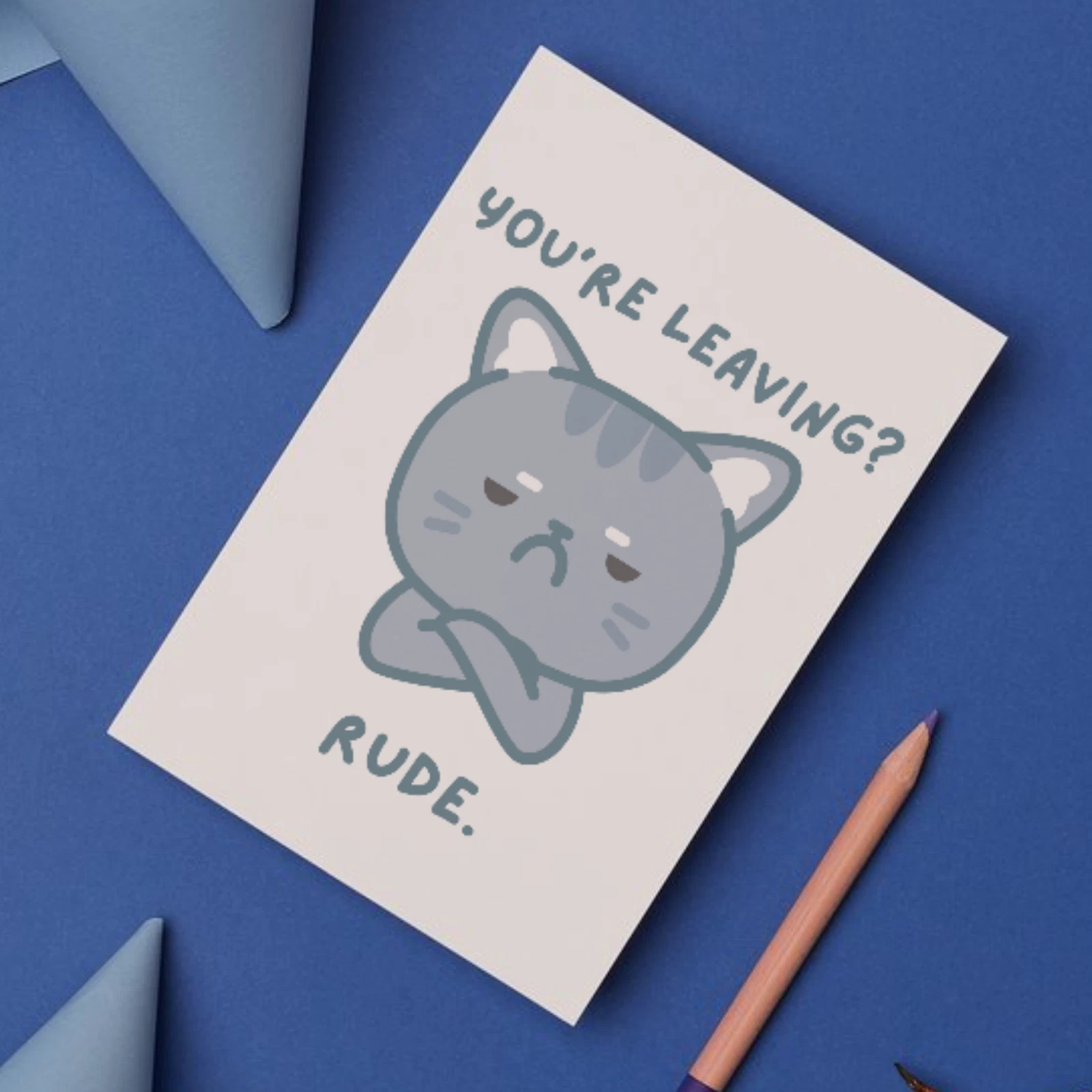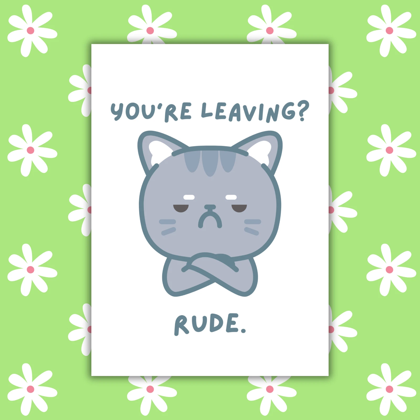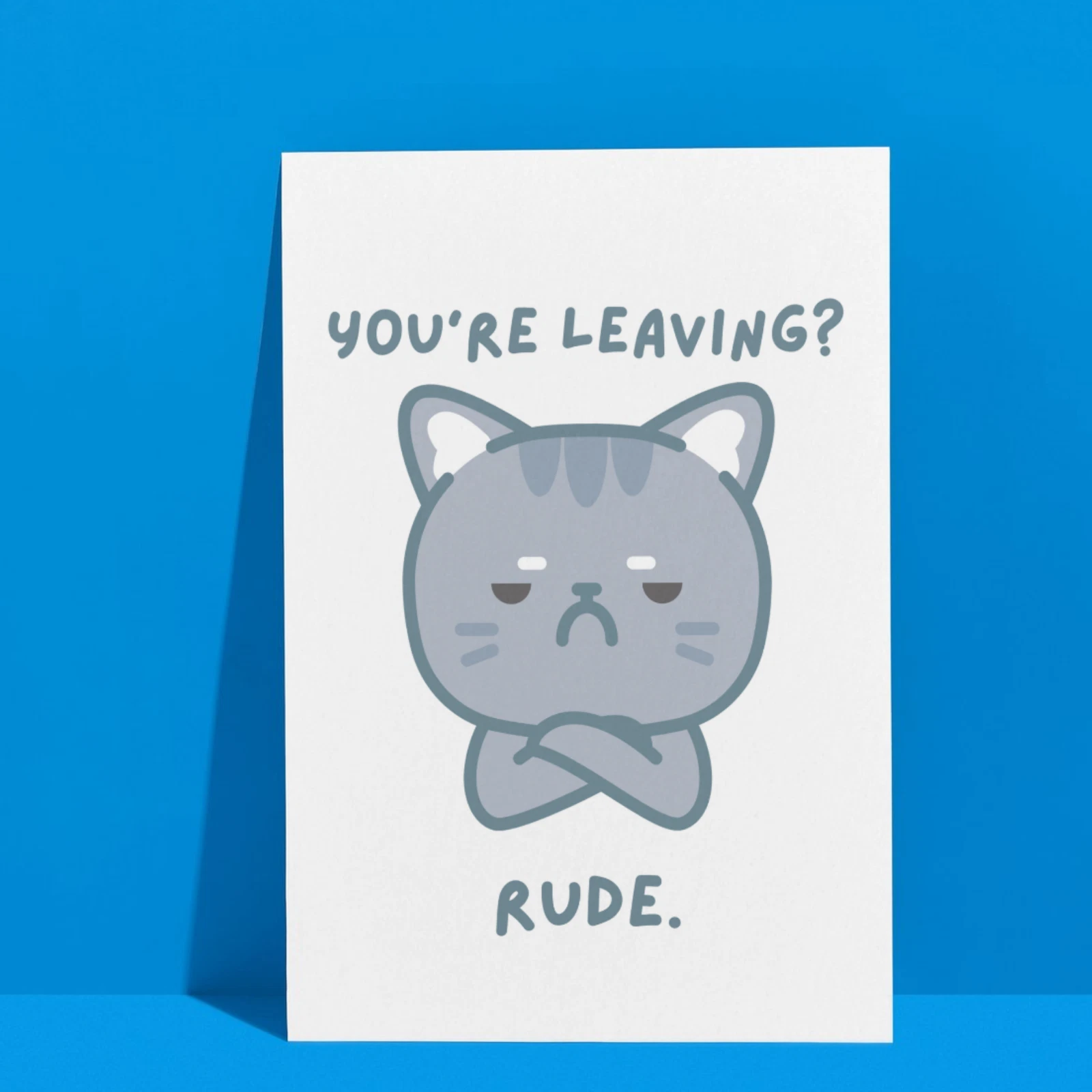 Featuring a grumpy cat with its arms crossed, this card is perfect for coworkers, friends, or anyone whose departure feels, wellโฆ really rude. A funny and relatable way to say goodbye while showing just how unimpressed you are.