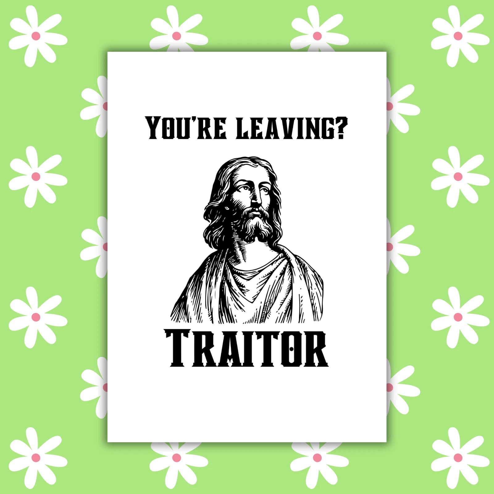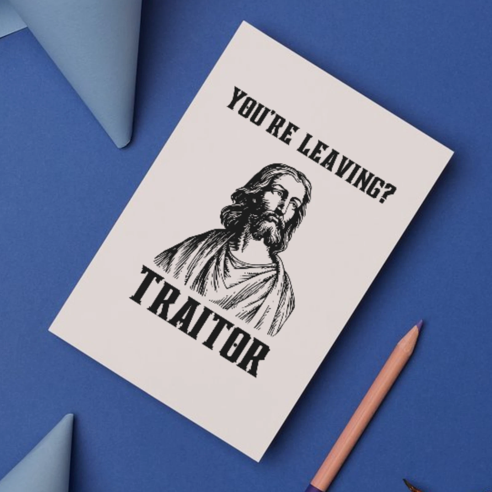 Featuring a cheeky illustration of Judas, this card is perfect for coworkers, friends, or anyone whose departure feels… intense. A funny, over-the-top way to say goodbye while exaggerating just how much you’ll miss them.