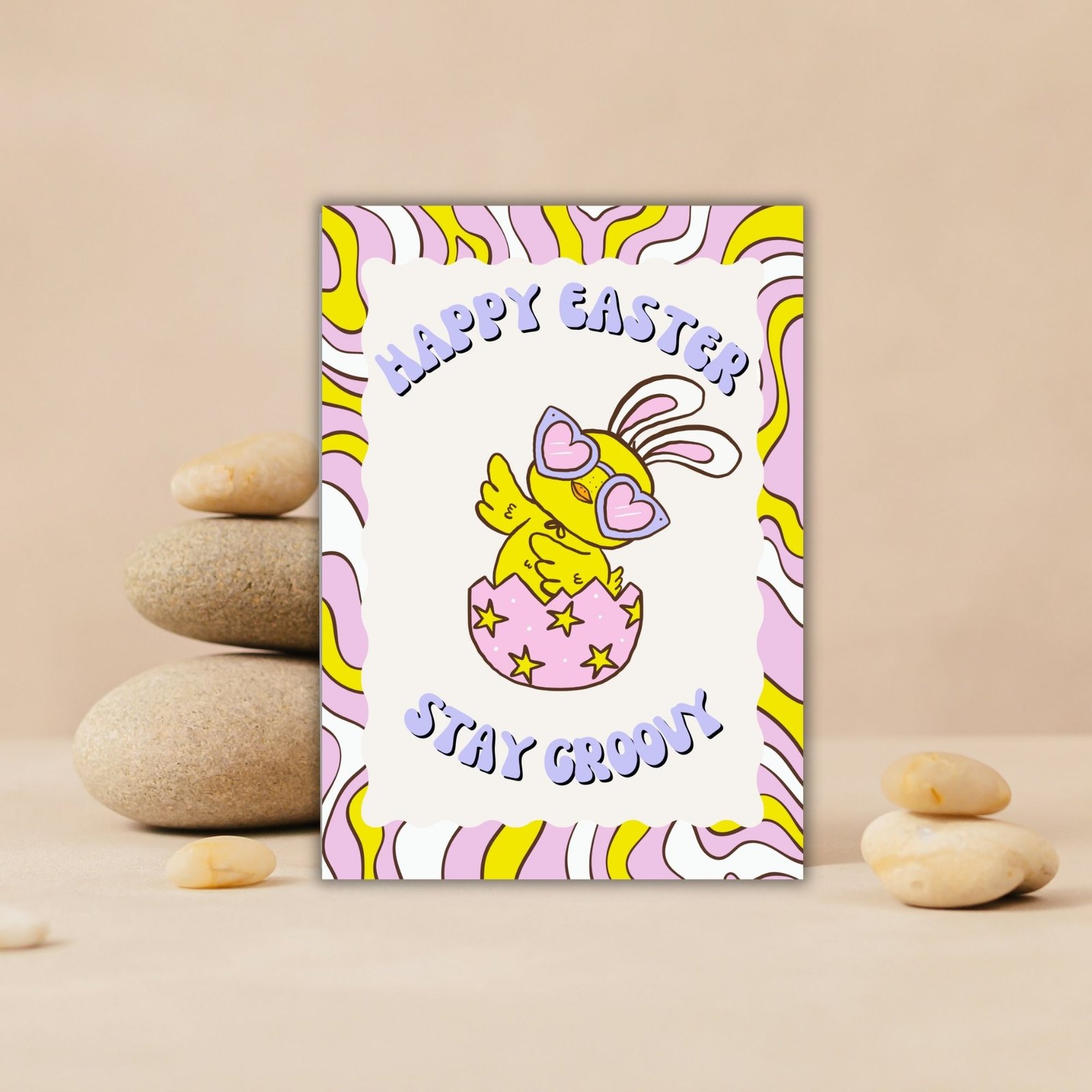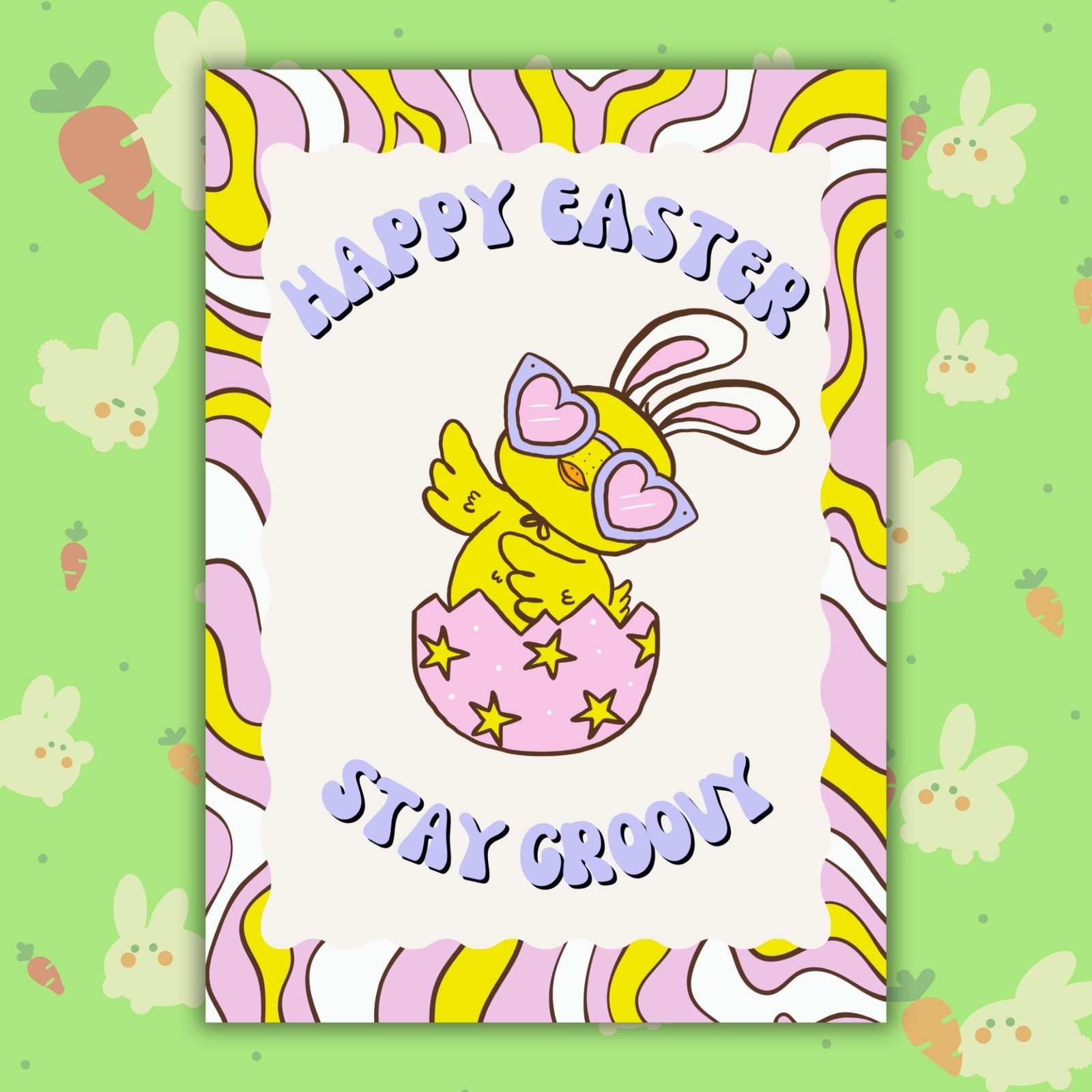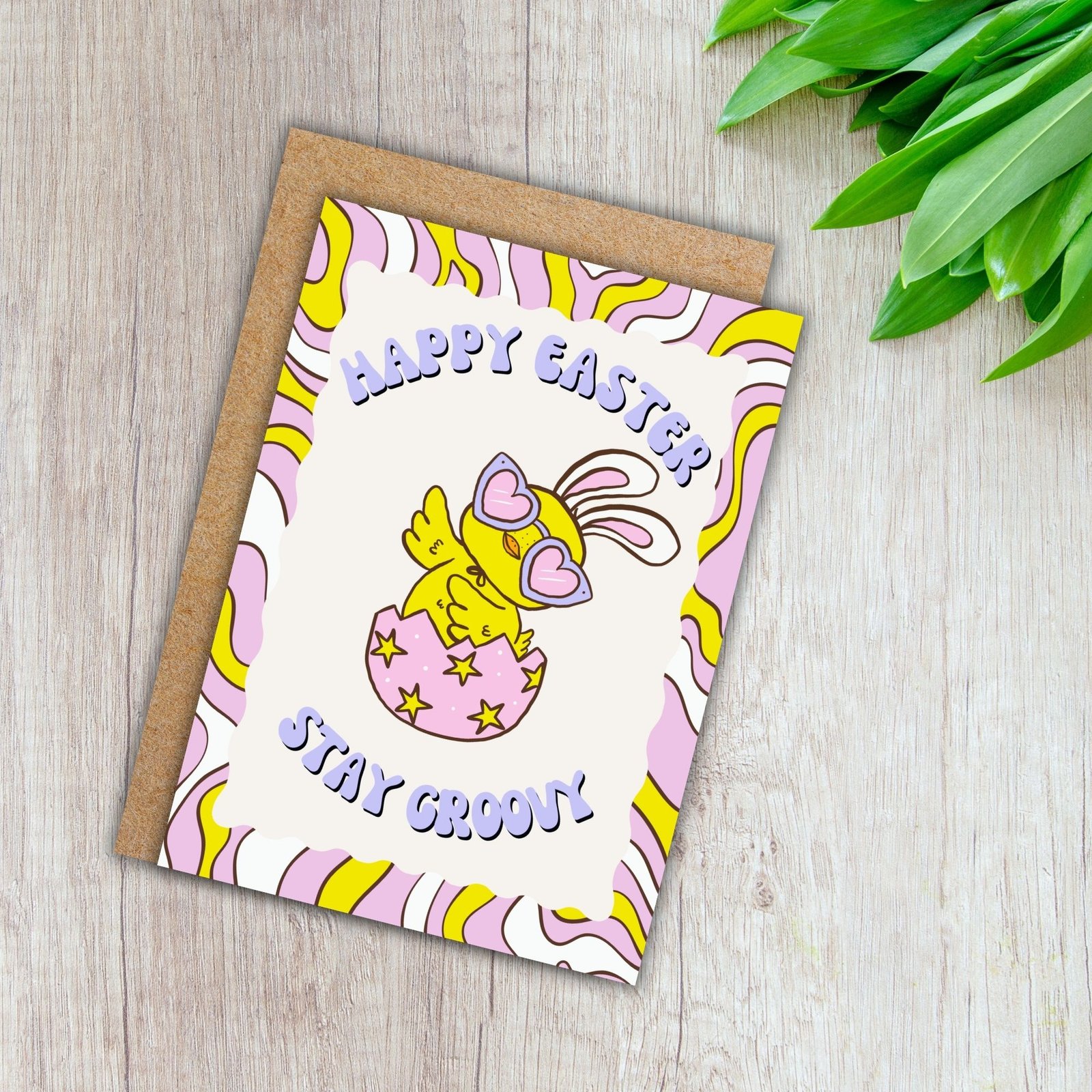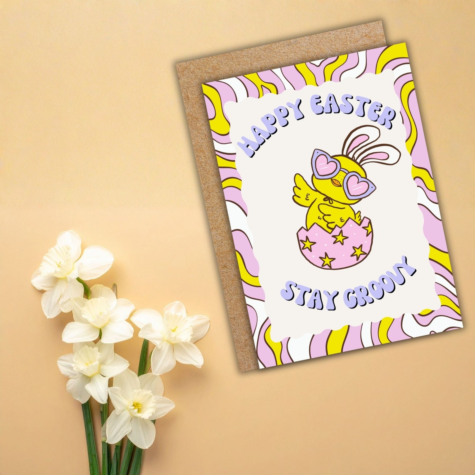 Featuring a fabulous little disco chick bringing full retro sparkle, this Easter card is perfect for anyone who likes their spring celebrations with a side of glitter and groove.