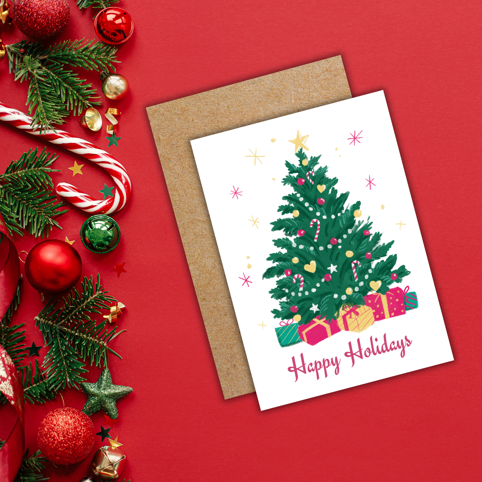 Share the magic of the season with this festive Christmas tree card! With its sparkling design and warm “Happy Holidays” message, it’s the perfect way to send your greetings to loved ones near and far.