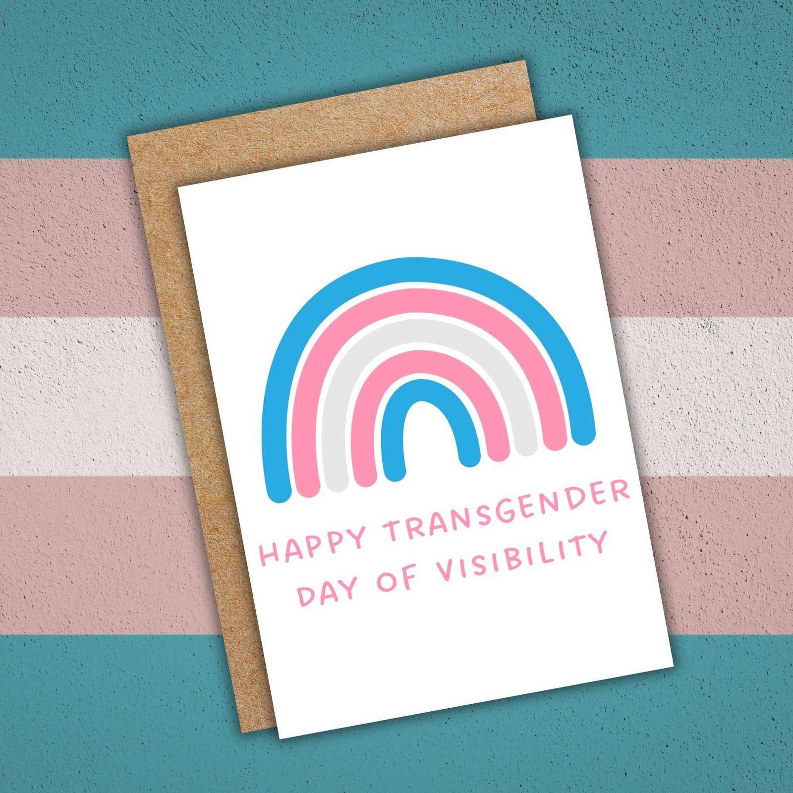 This design features a rainbow in the soft blue, pink and white of the transgender flag — a modern, uplifting way to mark March 31st and honour someone’s identity.