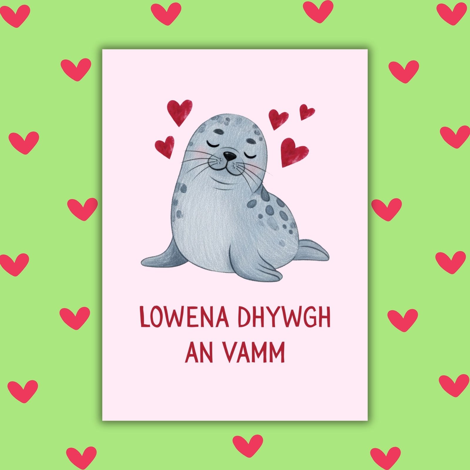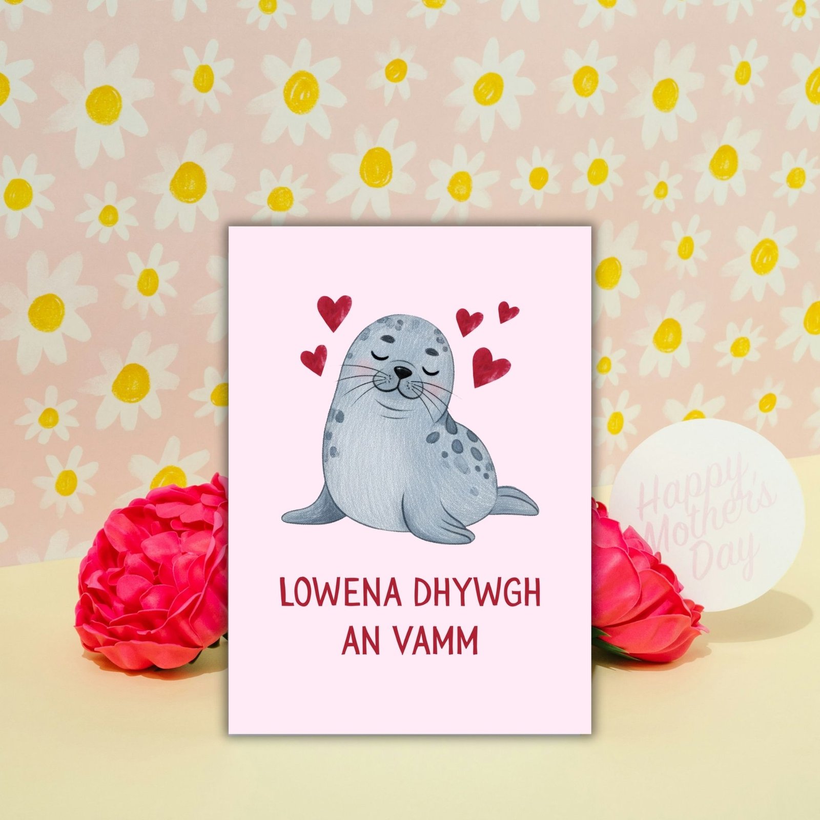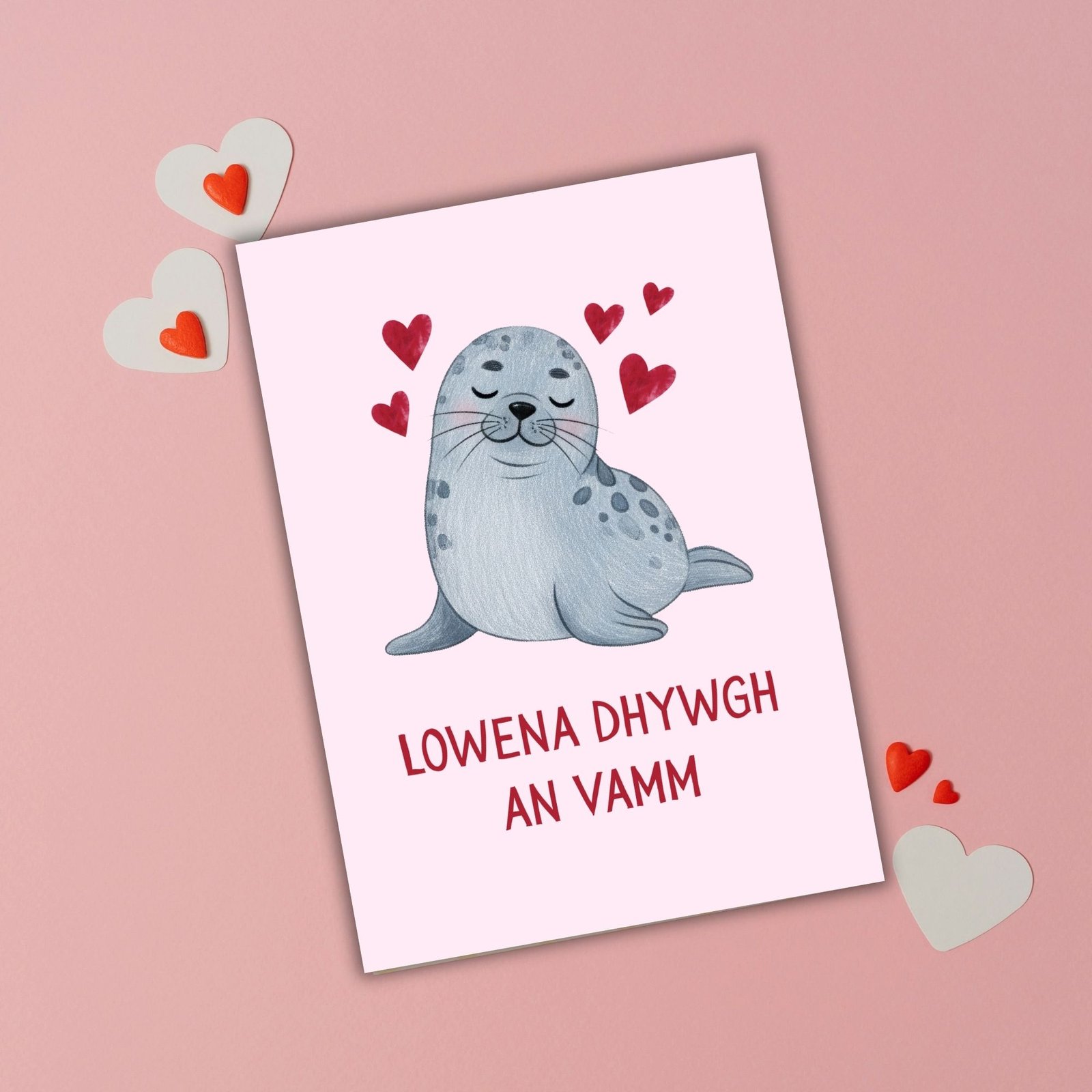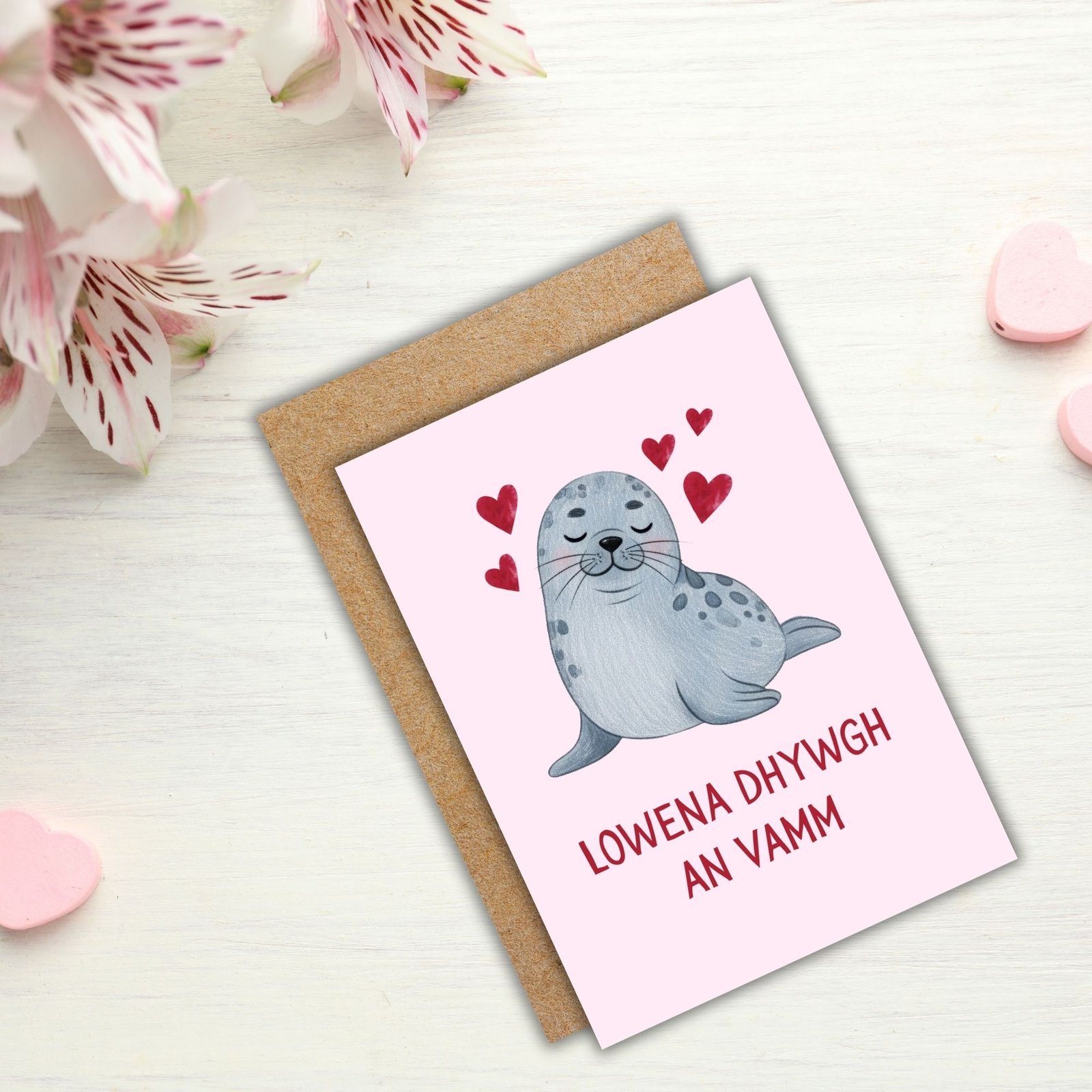Poetic and meaningful, this Cornish greeting offers a warm and thoughtful way to celebrate Mum — perfect for those with Cornish roots or a love of Celtic languages. The seal adds a soft coastal touch, inspired by the shores of Kernow.