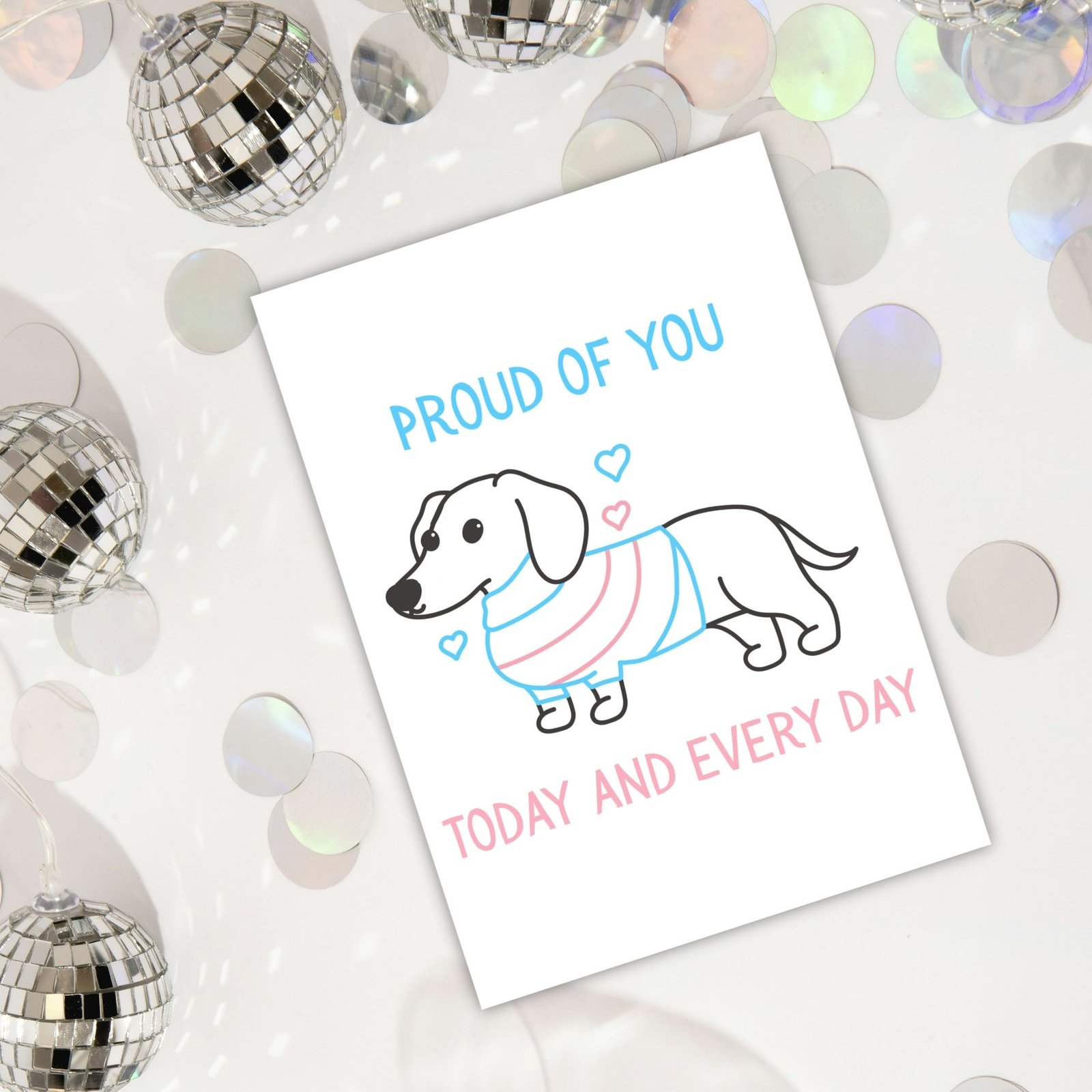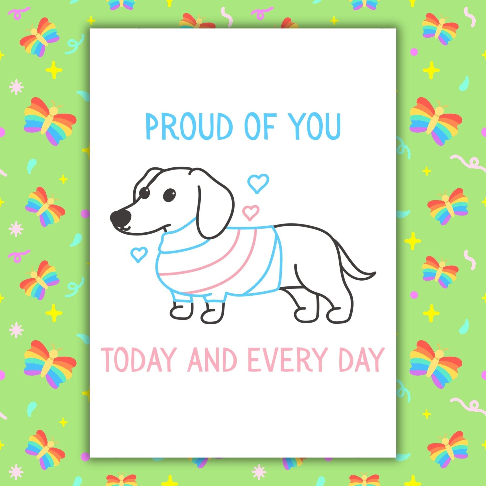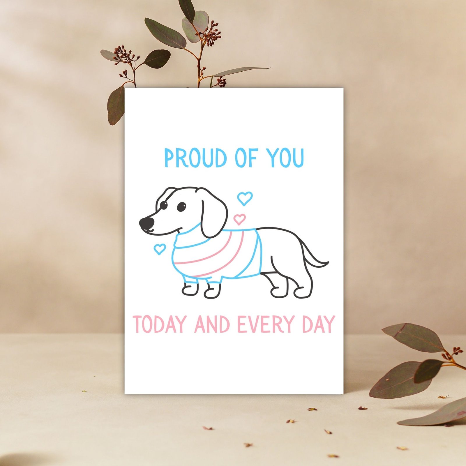This design features a playful sausage dog wearing the soft blue, pink and white of the transgender flag. Quirky, cheerful and heartwarming, it’s a perfect mix of joy and support.
