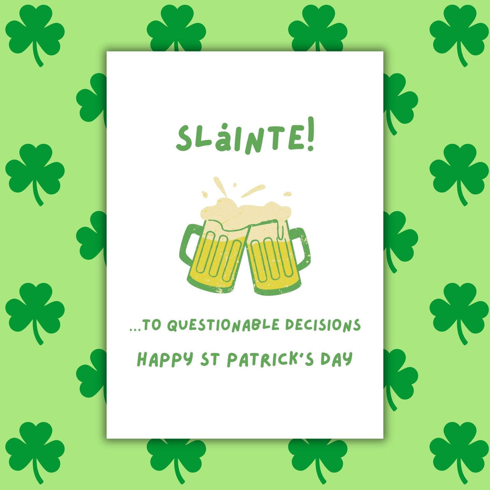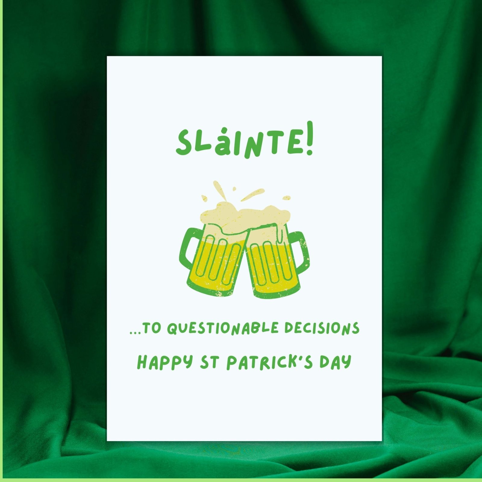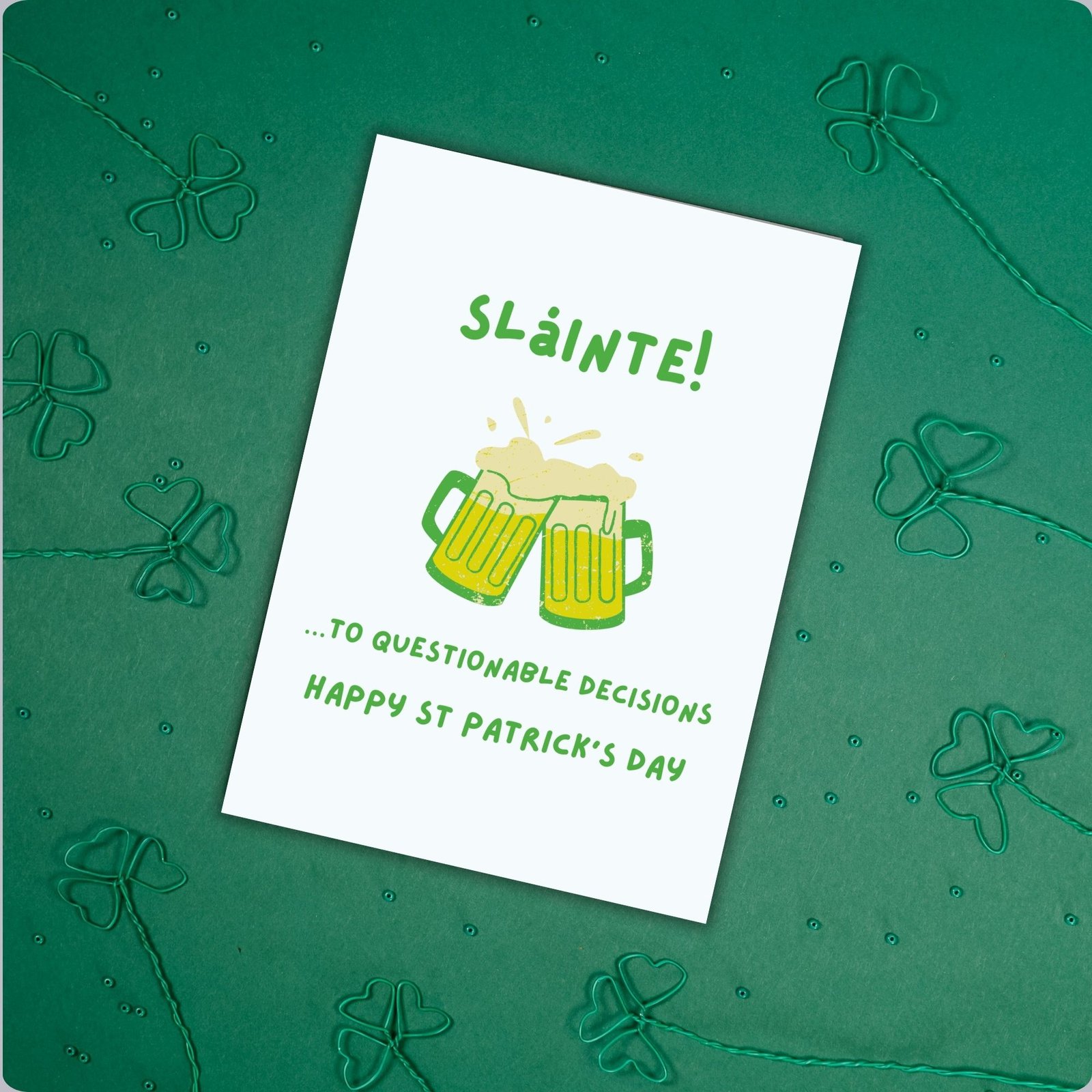 Celebrate the day with a wink and a clink: “Sláinte …to questionable decisions.” Perfect for friends, partners, or anyone who enjoys the craic with a little chaos sprinkled in.