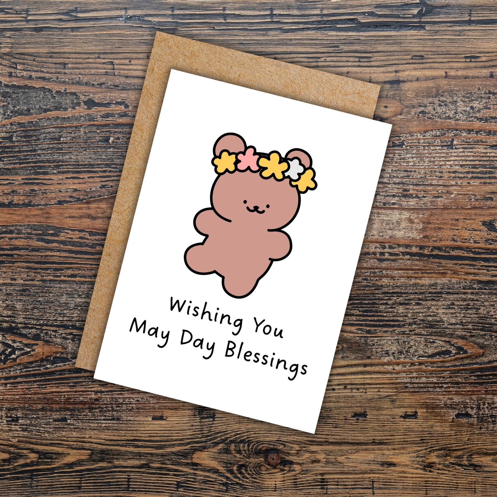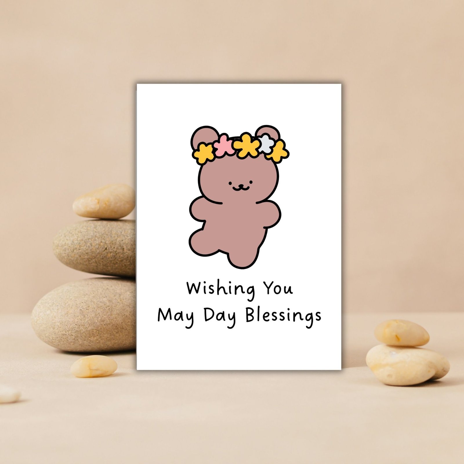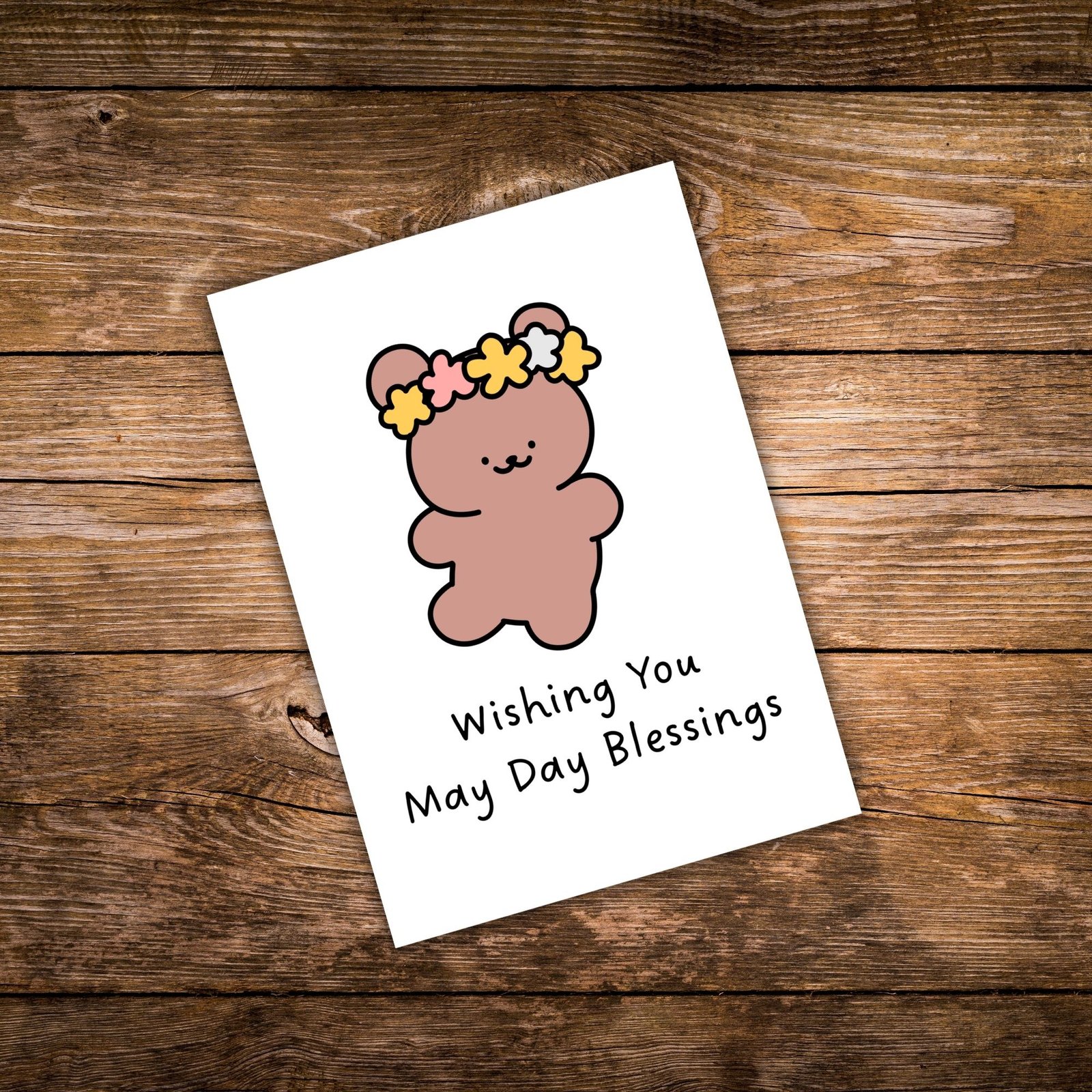 Celebrate the joy and warmth of May Day with this sweet greeting card, featuring a teddy bear wearing a delicate flower crown.