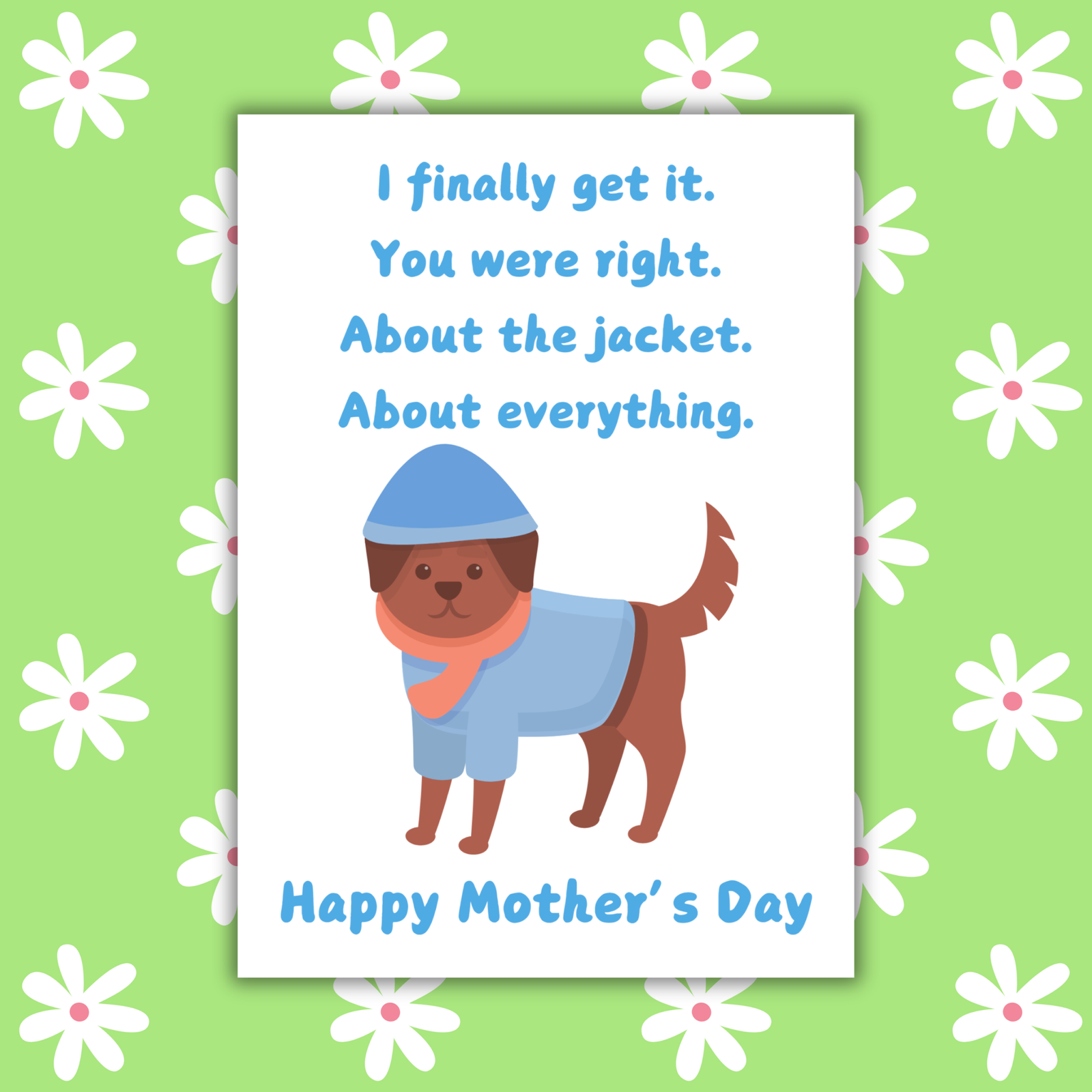 Remember all those times Mum told you to take a jacket, and you stubbornly refused? (And then regretted it later, of course!) This hilarious Mother’s Day card is a perfect tribute to Mum’s wisdom and our tendency to learn things the hard way. It’s a fun and relatable way to acknowledge Mum’s sage advice (and maybe finally admit she was right all along!).
